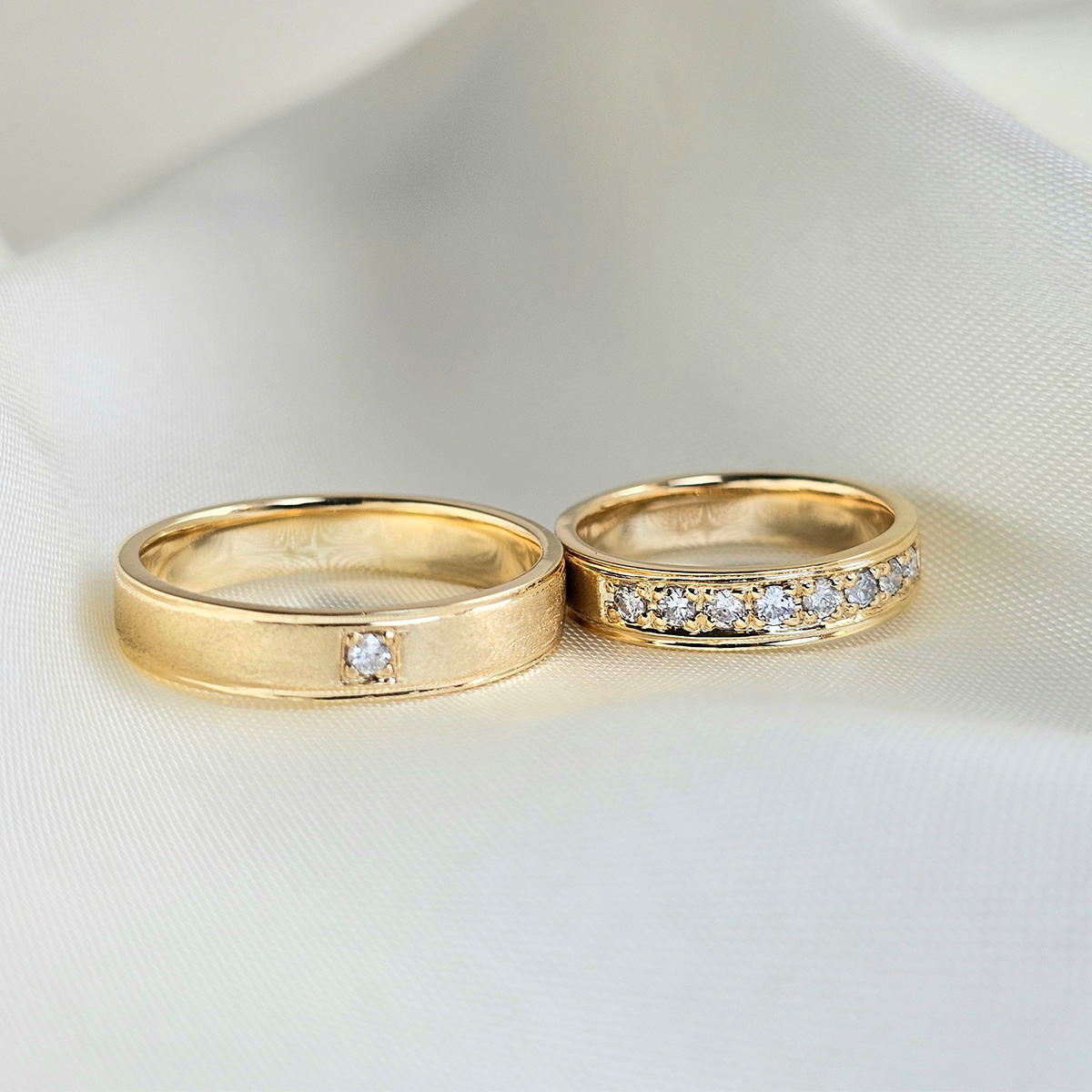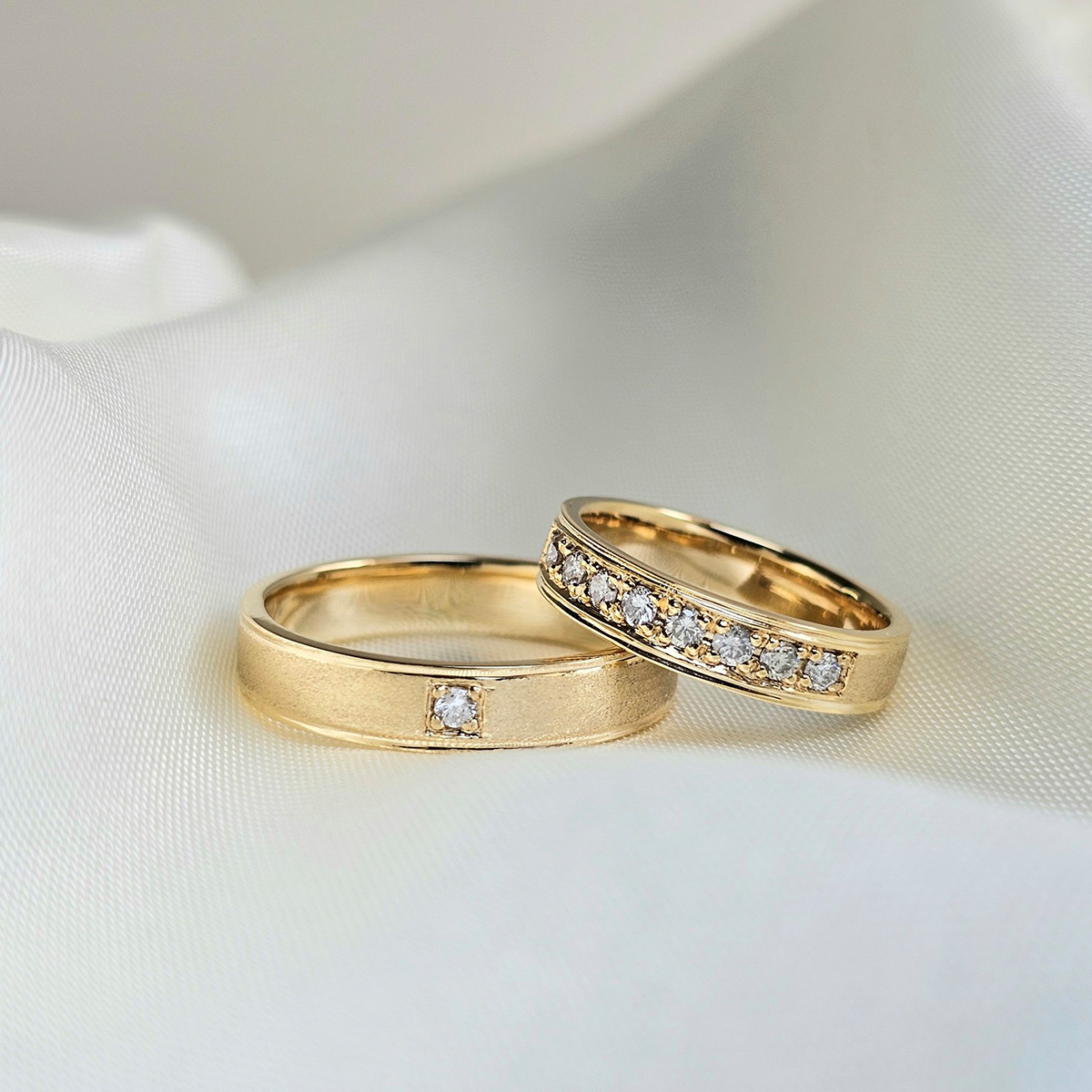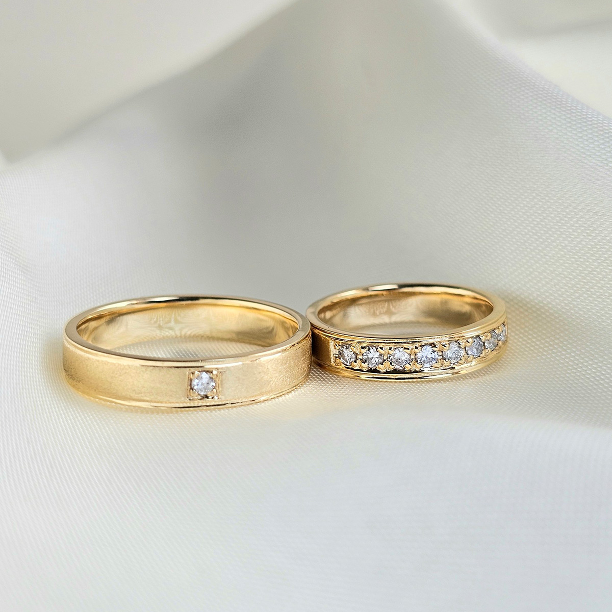 The AMARA Wedding Ring with diamond accents boasts a quiet strength and timeless allure. Each diamond, carefully placed, symbolizes unwavering commitment and enduring love. This ring speaks volumes in its understated elegance, embodying the profound bond shared between two souls.